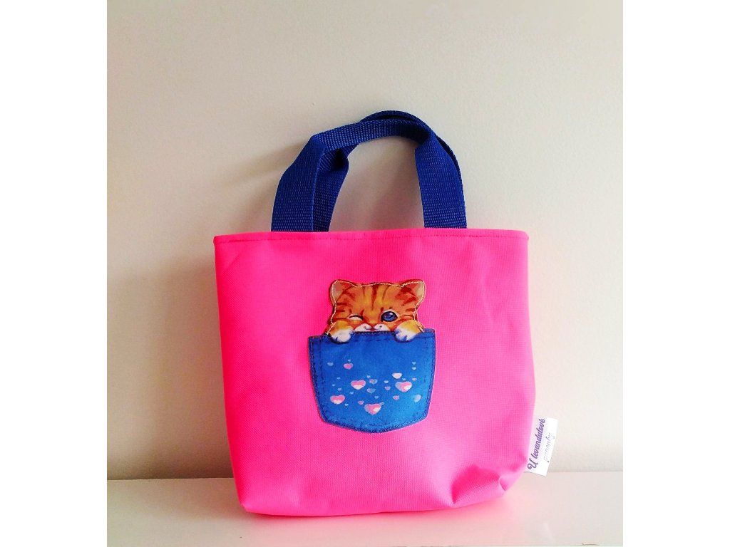 Uši jsou z bavlněných popruhů, d. 25 - 26 cm. Uprostřed jsou prošité pro lepší manipulaci a držení tašky pro dětské ruce.