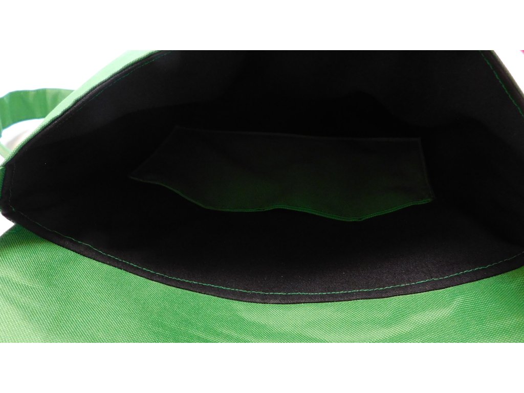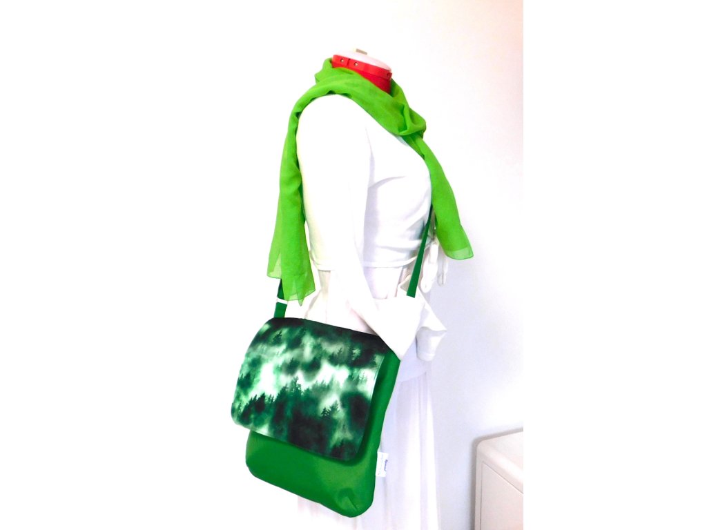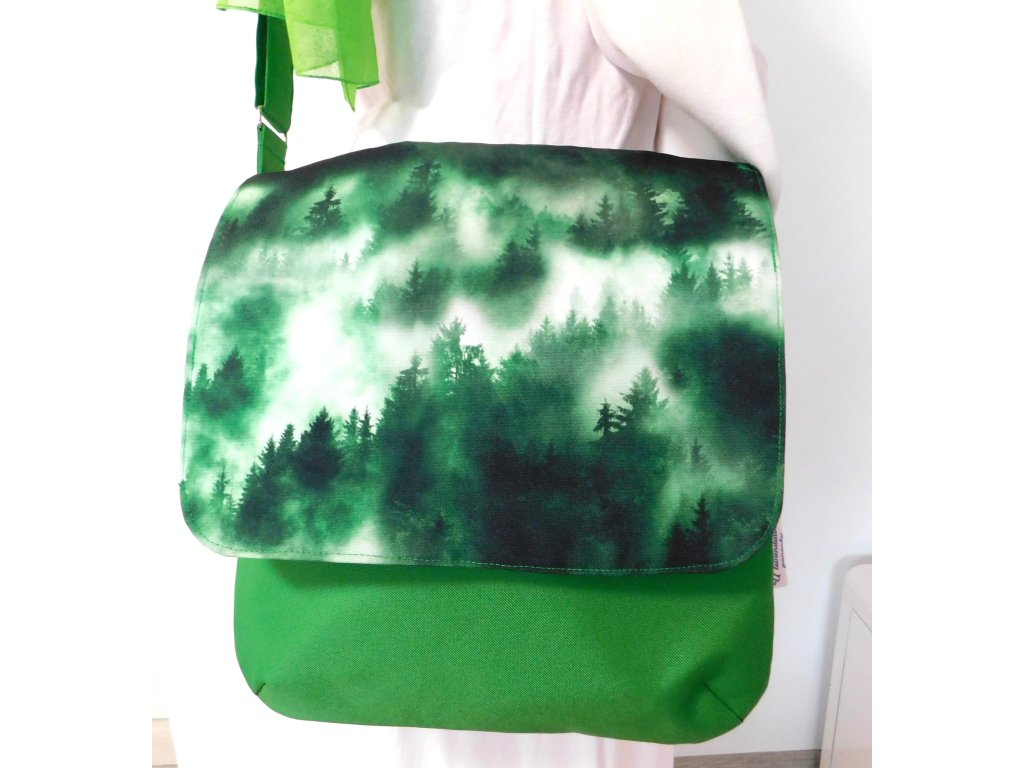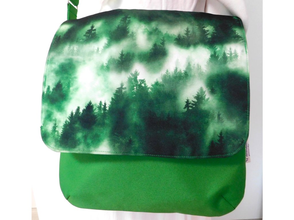 Kabela je vyztužená, ušita z částečně nepromokavé kočárkoviny, na rubu má nepromokavý zátěr. Obrázek lesa je na přední klopě. Digitální potisk.